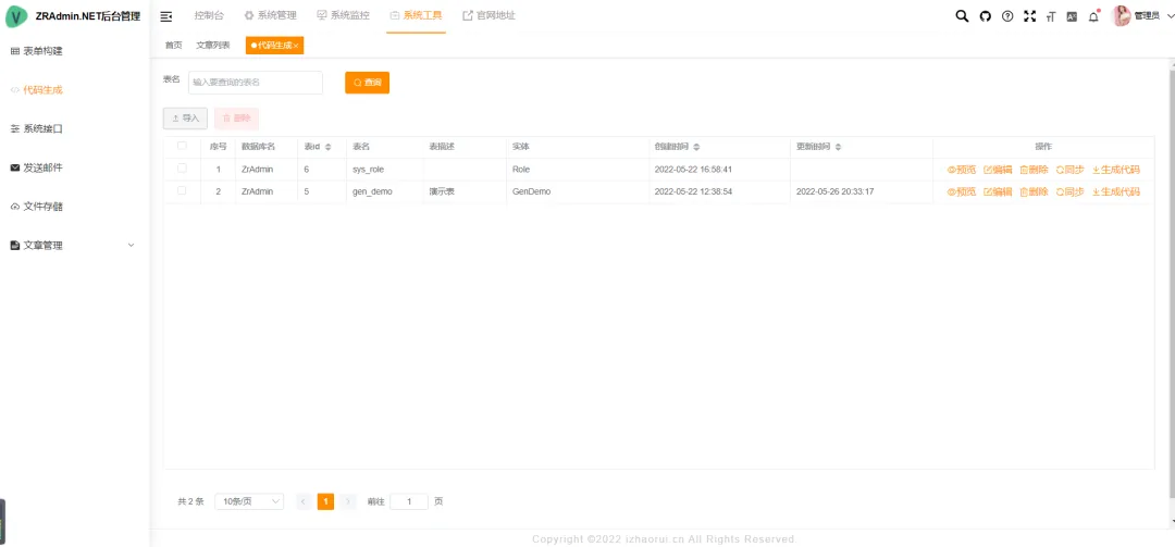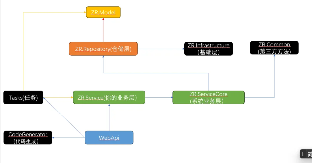 ├─ZR.Service ->[你的业务服务层类库]:提供自己业务数据Api接口调用;├─ZR.ServiceCore ->[系统服务层类库]:提供系统Api接口;├─ZR.Repository ->[仓库层类库]:方便提供有执行存储过程的操作;├─ZR.Model ->[实体层类库]:自己业务库表、数据传输对象;├─ZR.Admin.WebApi ->[webapi接口]:为Vue版或其他三方系统提供接口服务。├─ZR.Tasks ->[定时任务类库]:提供项目定时任务实现功能;├─ZR.CodeGenerator ->[代码生成功能]:包含代码生成的模板、方法、代码生成的下载。├─ZR.Mall ->[商城后端]:商城相关的后端代码。├─ZR.Vue ->[前端UI]:vue2.0版本UI层(已经不再更新推荐使用vue3)。├─document ->[文档]:数据库脚本(已弃用)