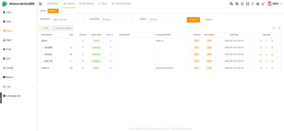 - 菜单管理:配置系统菜单、操作权限及按钮级权限标识。