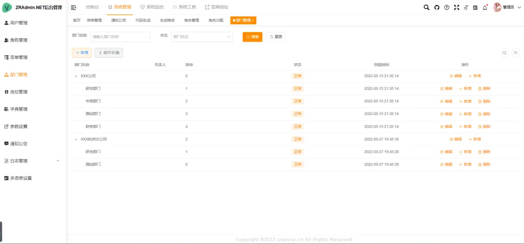 - 部门管理:以树形结构管理组织架构(公司、部门、小组),支持层级关系展示。