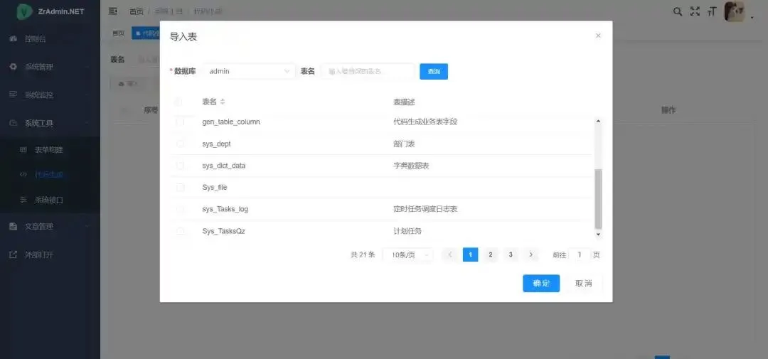 - 代码生成:一键生成前后端代码(.cs、.vue、.js、.sql、Uniapp等),支持自定义控件配置与下载。