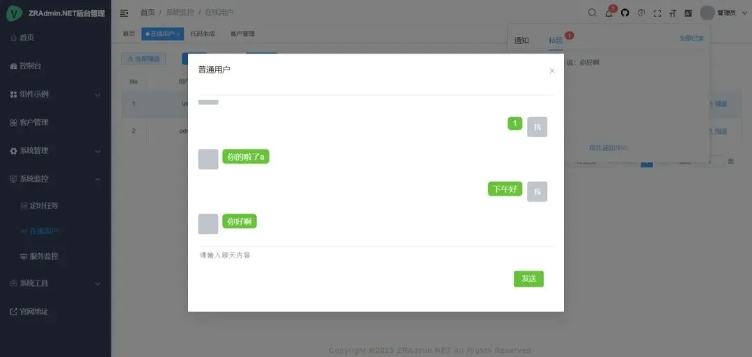 - 在线用户:查看当前登录用户列表,支持强制踢出或发送通知。