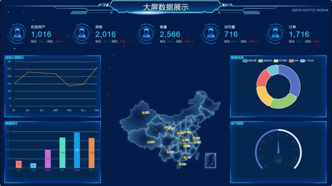 数据大屏:可视化展示关键数据指标,支持自定义图表配置。 -