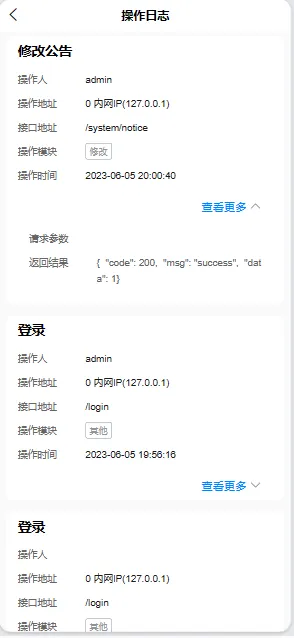 - 操作日志:记录系统正常操作及异常信息,支持按时间、用户等条件查询。