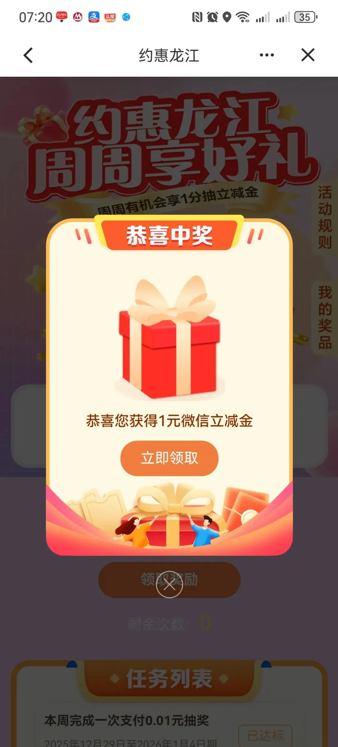 建设银行APP惠满龙江,周周享好礼支付1分钱抽微信立减金,最低1.01-1元