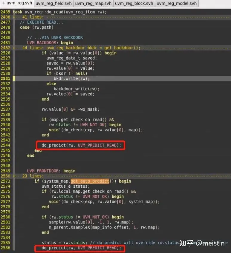 可以看到UVM_BACKDOOR是不管auto_predict有没有打开都自动调用do_predict(),这是因为UVM_BACKDOOR并不会产生实际的总线行为,只能默认auto_predict功能打开了,否则就会漏掉寄存器的更新行为。而对于UVM_FRONTDOOR,do_read()就会进行判断是否打开了auto_predict,如果打开则会在调用do_read()的时候就调用do_predict(),如果没有则不会,那就是我们后面会讲到的关闭auto_predict时do_predict()是如何被调用的。
