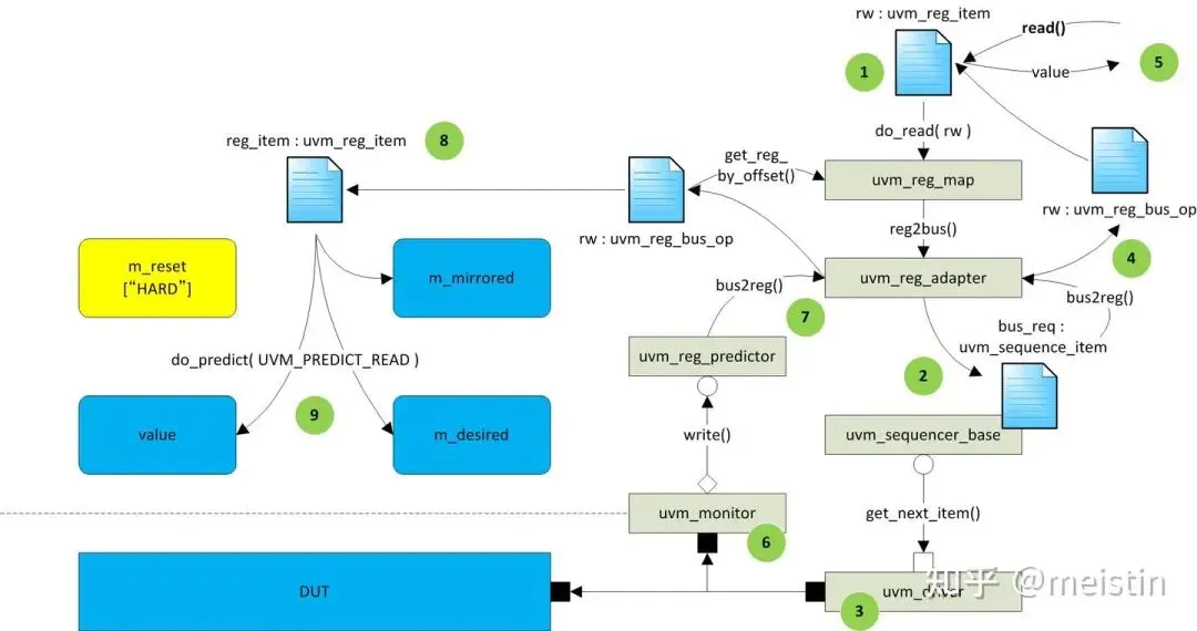 如果关闭自动预测功能,那么我们需要将uvm_reg_predictor实例化(或者继承一个我们自己的predictor),将predictor实例与我们monitor相连接(这里还需要我们monitor能够正确抓去总线数据),这样predictor就会实时的获取monitor所监测到的transaction信息,通过transaction中提供的address信息与uvm_reg_map中的寄存器address进行匹配进而发起相应的uvm_reg的predict()行为。这样一来uvm_reg的predict行为就跟寄存器模型中的读写行为脱钩了,只是跟monitor上的行为想关联,即使不是寄存器模型发起的读写(例如通过一般的sequence发起的总线读写),也是可以实时的更新寄存器模型中的镜像值和期望值,这样做更能保证寄存器模型中的值与DUT中的寄存器值最大程度的保持一致。
