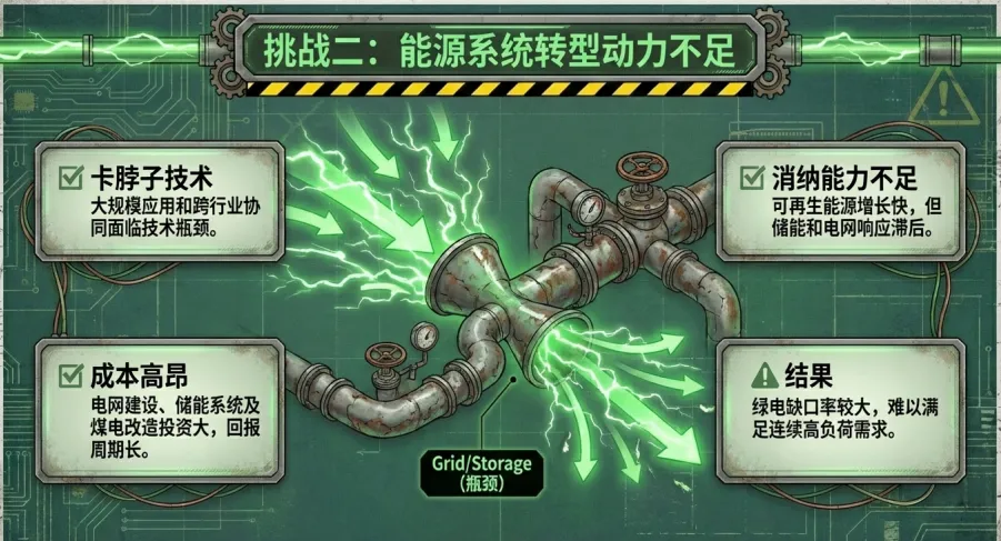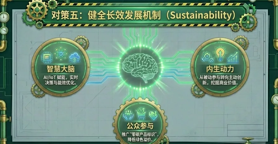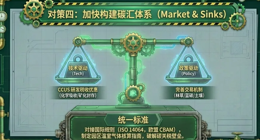 但试点推进的同时,零碳园区规模化建设仍面临四大核心挑战,成为转型路上的“拦路虎”。制度层面,政策体系碎片化、标准衔接不足,能源、环保等多部门存在信息孤岛,责任划分模糊;能源领域,可再生能源消纳能力不足、储能技术滞后,加之转型成本高昂、回报周期长,导致绿电缺口难以填补;产业协同方面,企业过度依赖政府补贴、存在观望心理,部分企业陷入“漂绿”误区,产业链纵向传导受阻、横向协同不足,难以形成转型合力;碳汇体系上,CCUS技术缺乏经济竞争力,林草碳汇核算复杂,国内标准与欧盟CBAM等国际规则脱节,出口型企业面临碳关税壁垒。