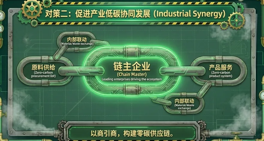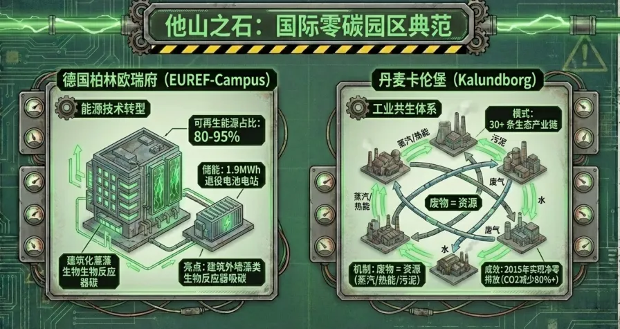 他山之石可攻玉,国际典范为我国零碳园区建设提供了重要借鉴。德国柏林欧瑞府园区以可再生能源为核心,搭配退役电池储能系统,创新采用建筑外墙藻类生物反应器强化碳吸收;丹麦卡伦堡园区构建30余条生态产业链,践行“废物=资源”理念,实现蒸汽、热能等资源循环利用,2015年便达成净零排放。结合国内实践与国际经验,我国需从五大维度精准发力:强化顶层设计,完善“国家+地方+团体”三位一体标准体系,建立跨部门协作机制;推动产业协同,依托链主企业带动产业链低碳转型,杜绝“漂绿”行为;加快能源转型,攻关零碳电力技术,优化储能与输电设施,构建绿色高效能源体系;健全碳汇市场,加大CCUS技术研发扶持,统一核算标准并对接国际规则;培育长效动力,以AI、IoT技术赋能智慧管控,激发企业内生创新活力,引导公众参与零碳建设。