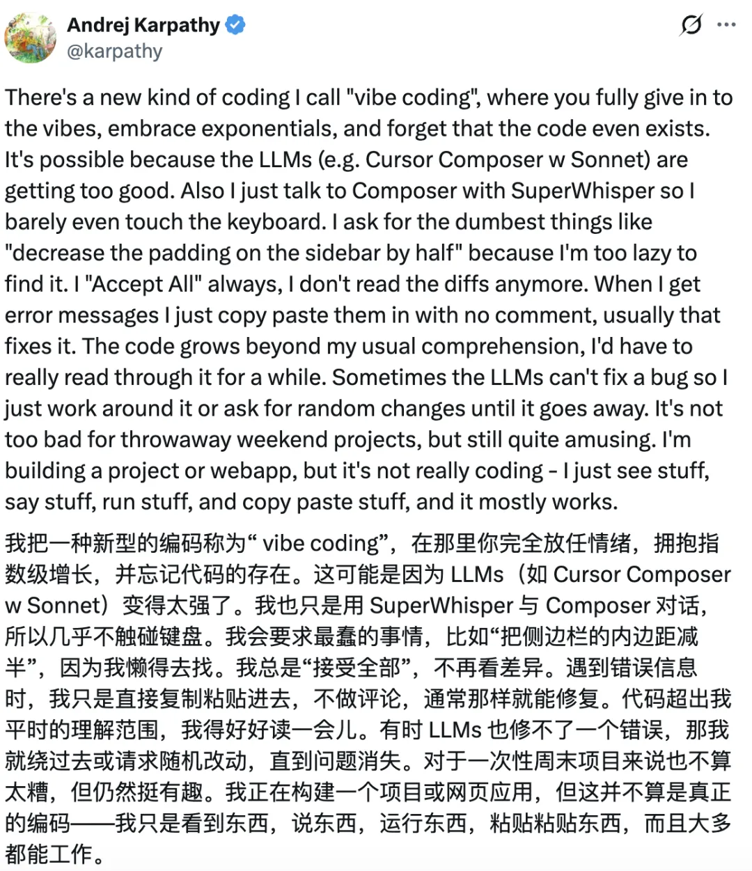 特斯拉前 AI 主管 Andrej Karpathy 给这种邪门的操作取了个极具赛博感的名字:Vibe Coding(氛围编码)。