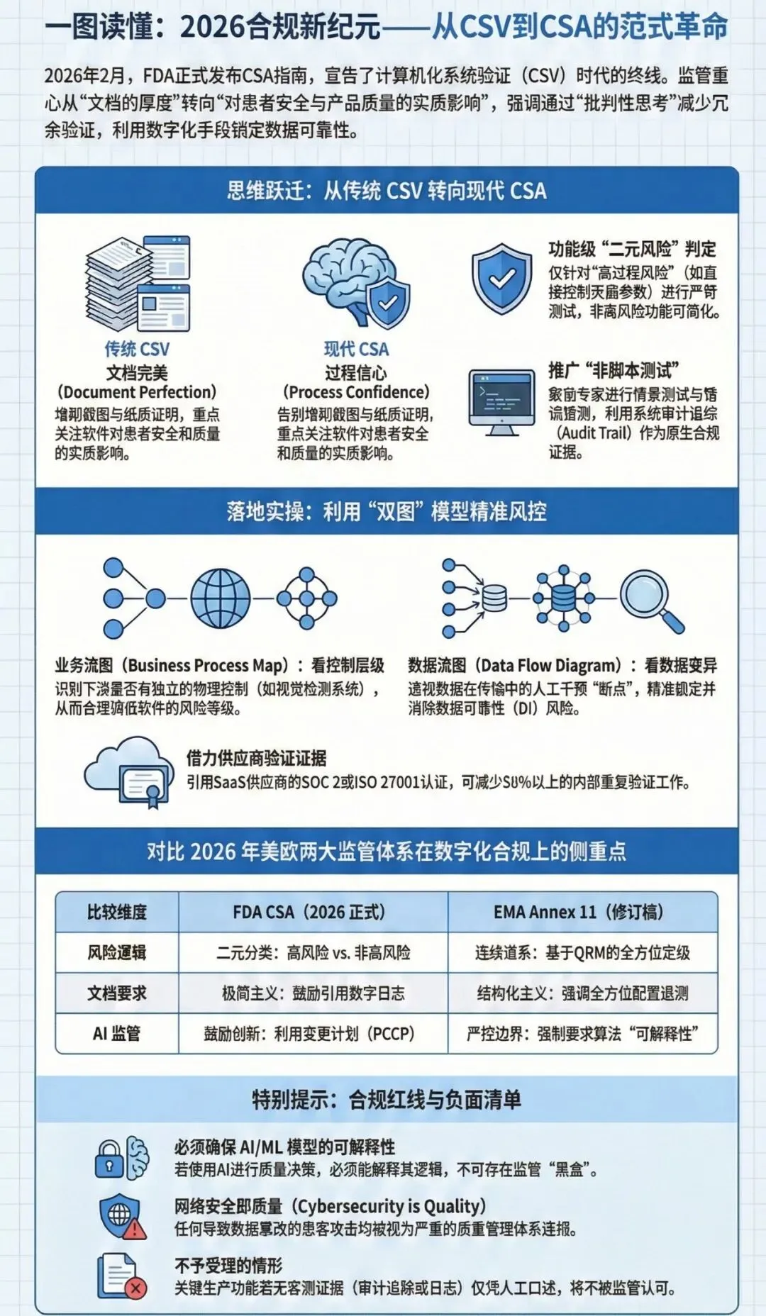 2026年2月,随着FDA正式发布《生产与质量管理系统软件的计算机化软件确认(CSA)》指南,以及欧盟EMA对Annex 11和Annex 22(AI专项)的深度修订,全球生命科学行业正式跨入了数字化监管的新纪元。