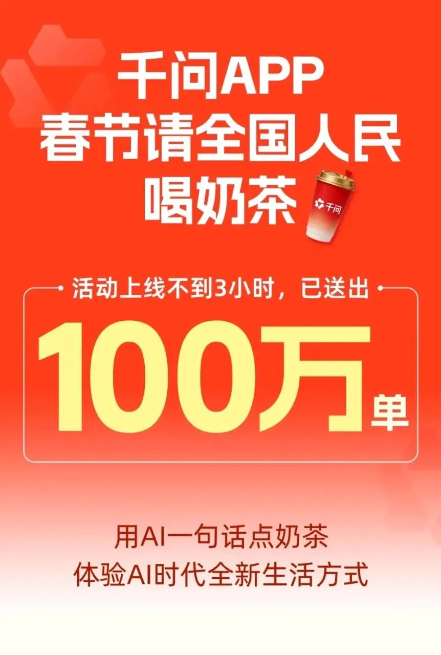 2026年2月6日,阿里千问APP“春节30亿大免单”活动正式上线。一句“帮我点杯奶茶”,用户只需支付0.01元,即可在全国30余万家茶饮、外卖、商超门店完成消费。上线9小时,平台AI订单量突破1000万单,千问APP登顶苹果App Store免费榜。这场以“AI请客”为名的数字消费浪潮,正以前所未有的速度从一线城市向县城、乡镇下沉,成为激活城镇消费经济的一剂强心针。