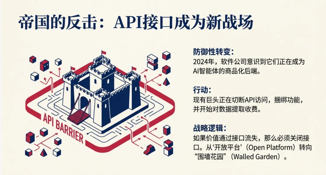 “到了2024年,情况发生了变化。这些老牌软件商发现,那些新兴的 AI 和智能体公司正在逐步接管它们的功能,仅仅把它们当成一个存数据的‘原始仓库’。于是从去年开始,你会看到这些公司纷纷收紧策略,切断了 API 的访问权限。”