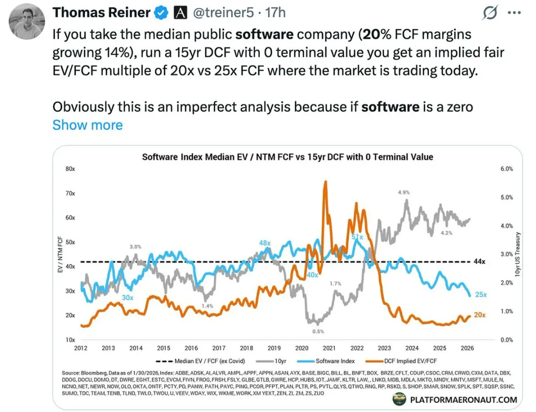 Thomas Reiner 在下方的推文中指出,即便一家公司能在未来 15 年内保持 14% 的增长(这已经远超一般的行业基准水平),其估值也“仅仅”相当于 20 到 25 倍的自由现金流(FCF)。