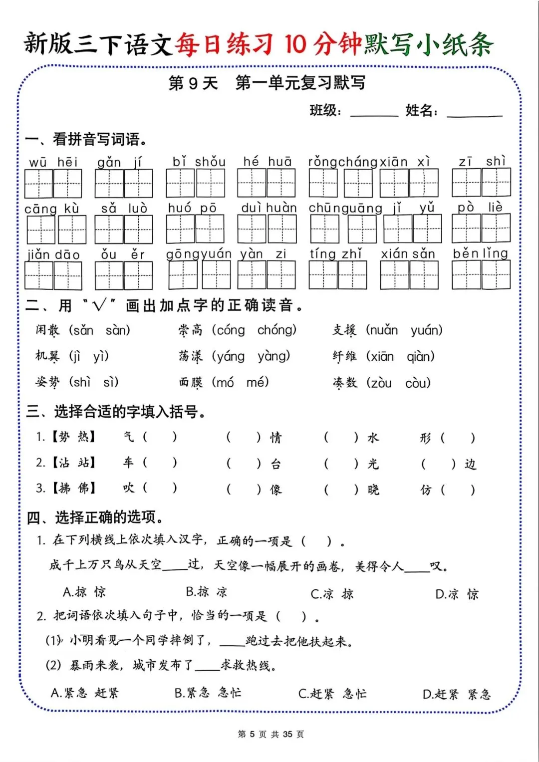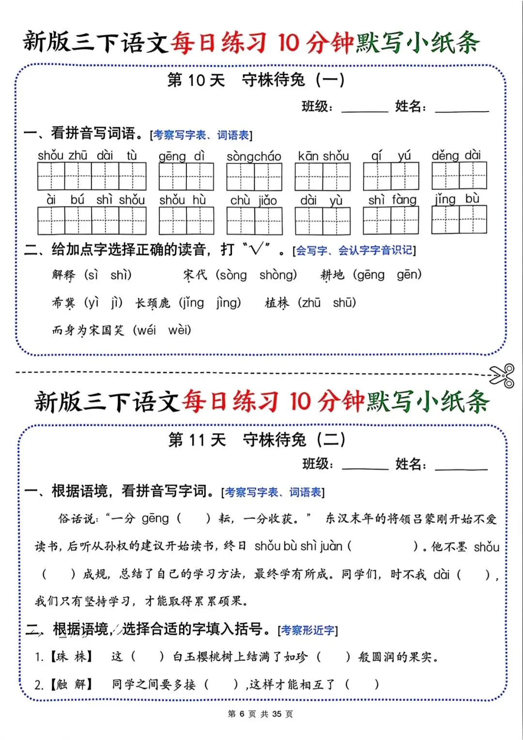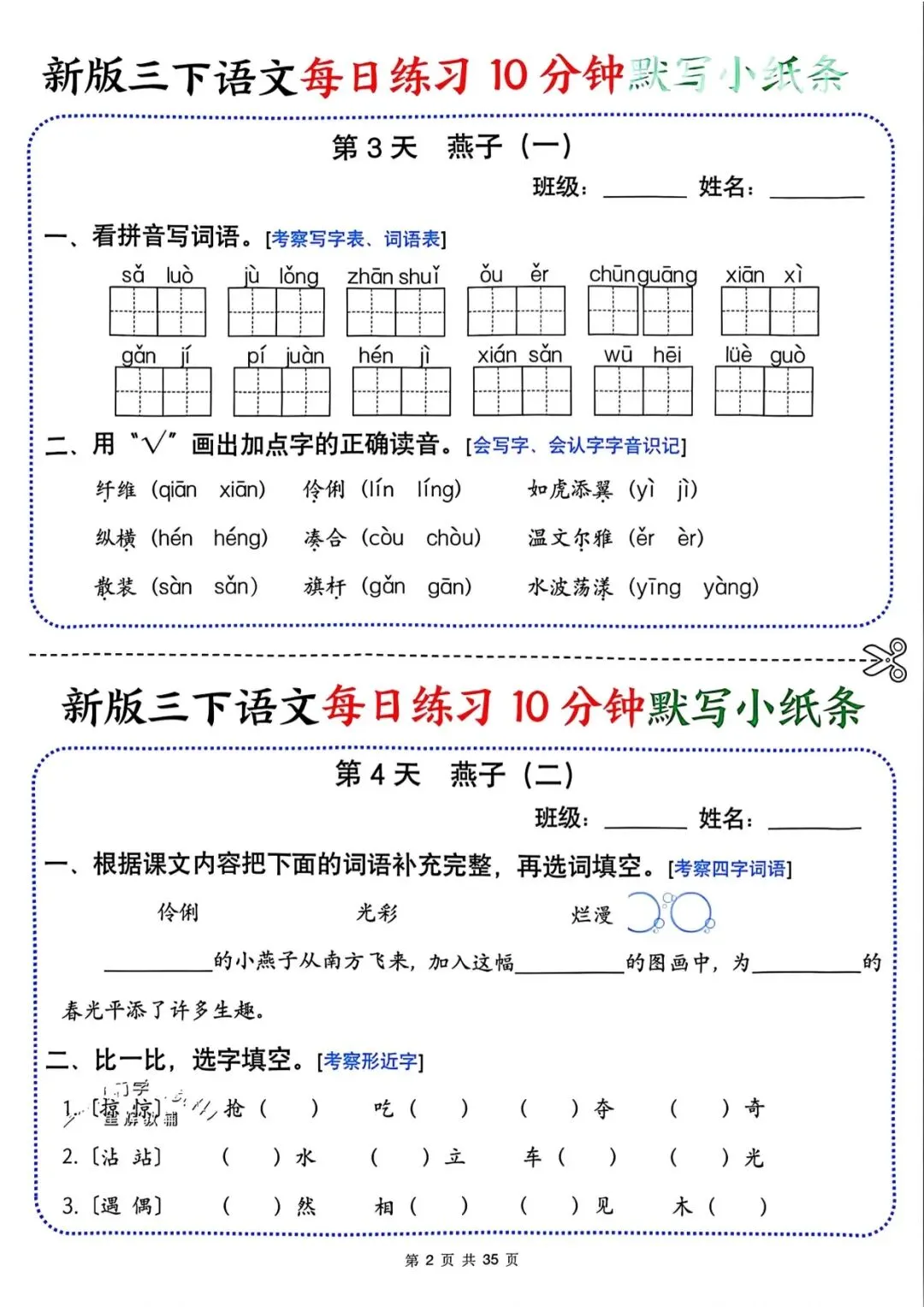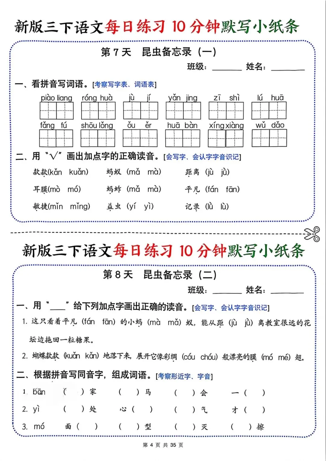专为三年级下册语文设计,共 35 页每日默写小纸条,覆盖看拼音写词语、字音辨析、形近字、古诗默写等核心考点,题量适中,每天 10 分钟,可打印裁剪随身练,夯实语文基础,提升默写准确率!