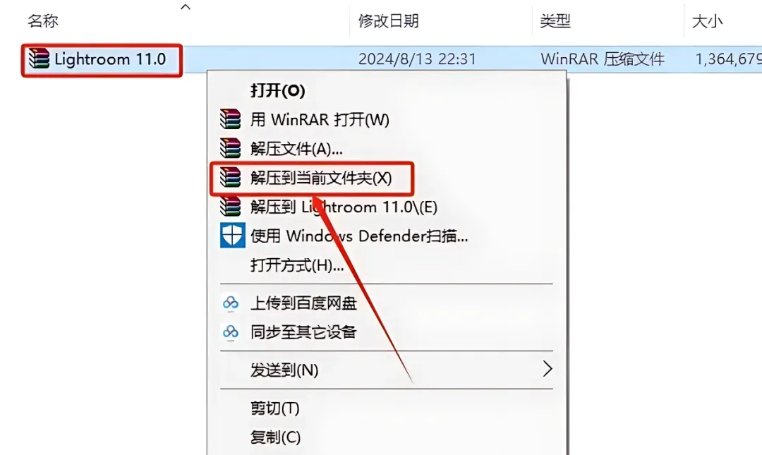 1.打开下载的Lr11.0软件安装包,鼠标右击压缩包选择【解压到当前文件夹】。