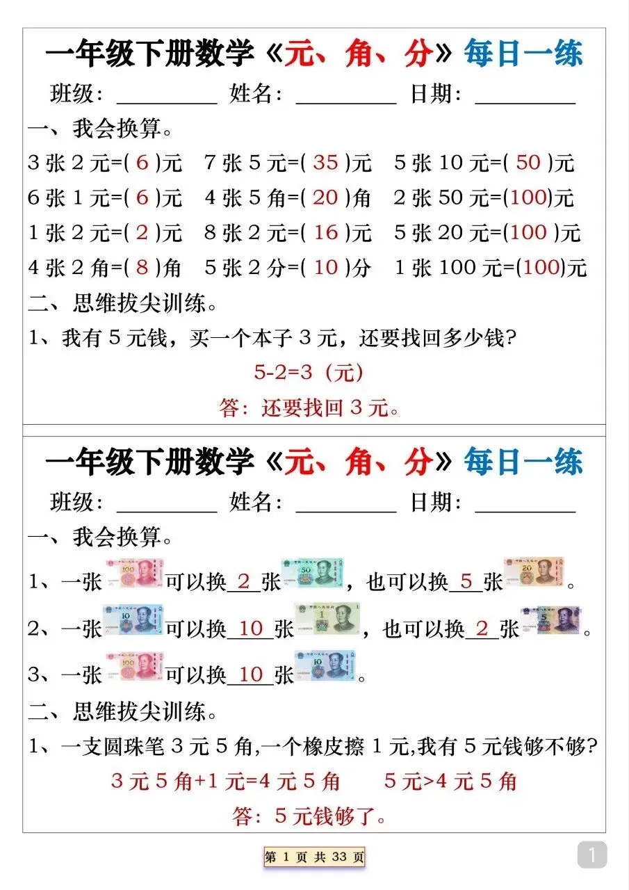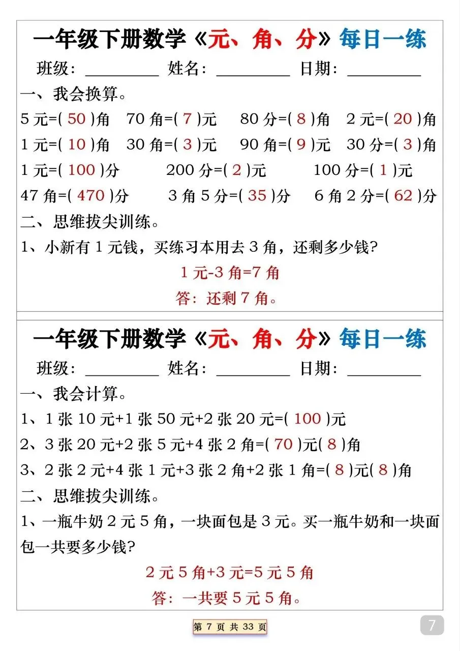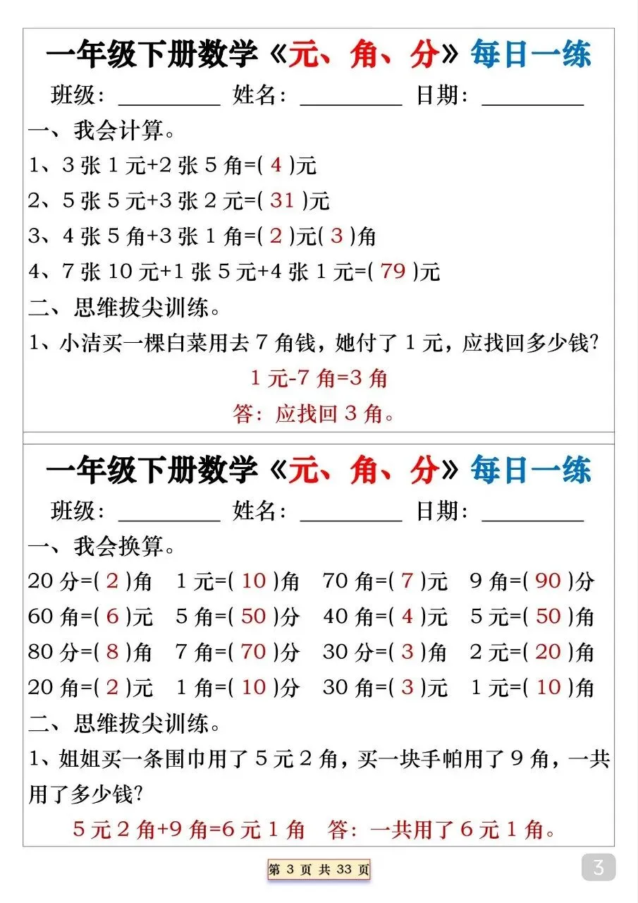 一年级(下)数学 元角分专项每日一练.pdf