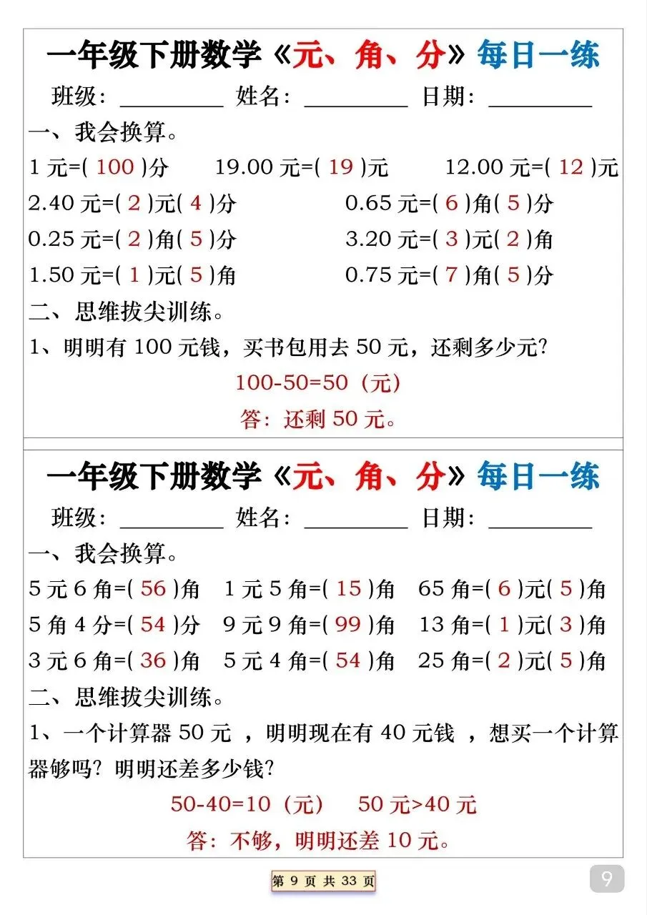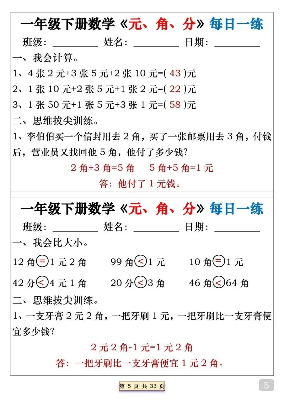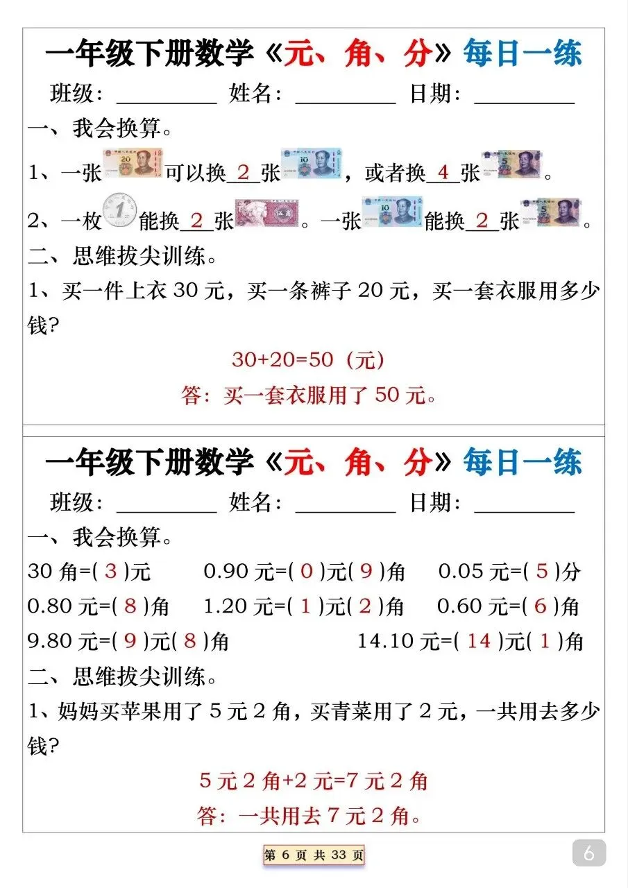 一年级(下)数学 元角分专项每日一练.pdf