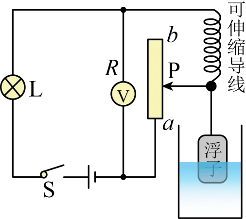 10. 如图所示是一科技创新小组同学们设计的水位计工作原理图,绝缘浮子随水位的升降带动滑动变阻器R的金属滑杆P升降,通过电压表显示的数据来反映水位升降情况,水位最低时,滑杆P位于R的a端处.L是一个指示灯,电路各部分接触良好,不计导线电阻.下列判断正确的是()