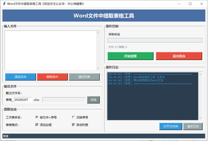 关注“办公神器集”公众号,回复“50”或“Word文档中提取表格工具”即可免费获取该工具。请帮忙分享到朋友圈,大家一起共享好工具。