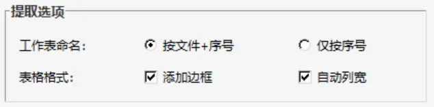 五、提取选项:工作表命名可以文件名+序号或者单纯序号,表格格式可以选择添加边宽和自动列宽。