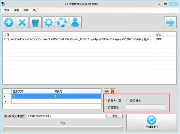 免费版提供两种替换模式:既能批量处理多个PDF文件,也能指定页面范围进行局部替换。更牛的是,它还支持用图片或文本精准替换某个位置的原文。