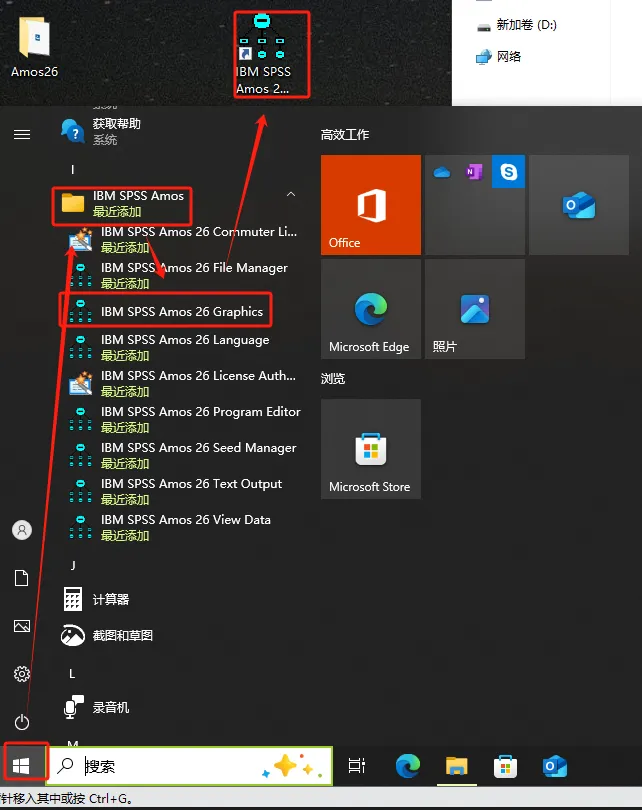 第十二步:依次点击电脑【开始】【IBM SPSS Amos】找到【IBM SPSS Amos 26 Graphics】,将其拖到桌面。如下图。