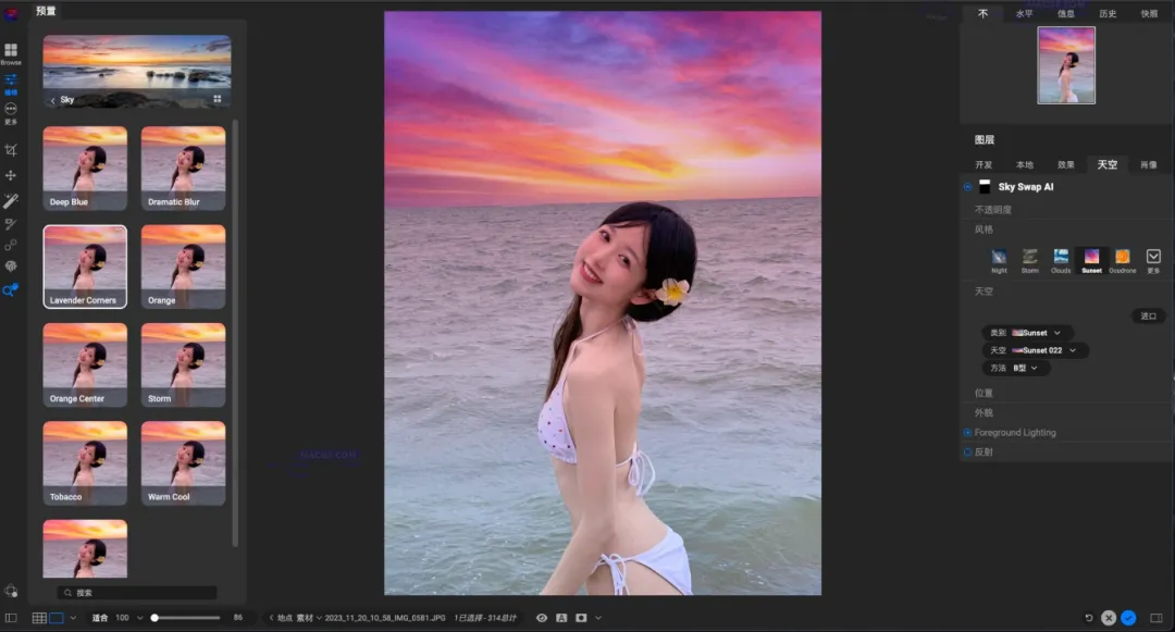 天空替换工具:自动识别天空区域,匹配光影一致的替换素材;