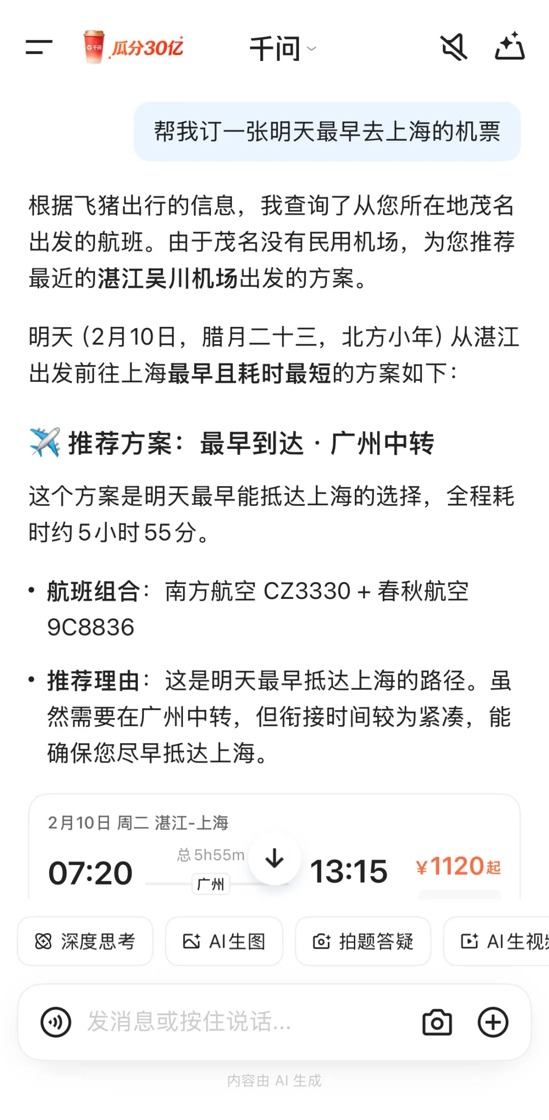 在实际体验中,千问展现出了相当强大的任务处理能力。有用户在对话页面查询《疯狂动物城2》的场次时,AI会直接推荐特惠场次,标注24.9元的特惠价——比其他平台便宜一半,还贴心提示“现在出发还来得及”。