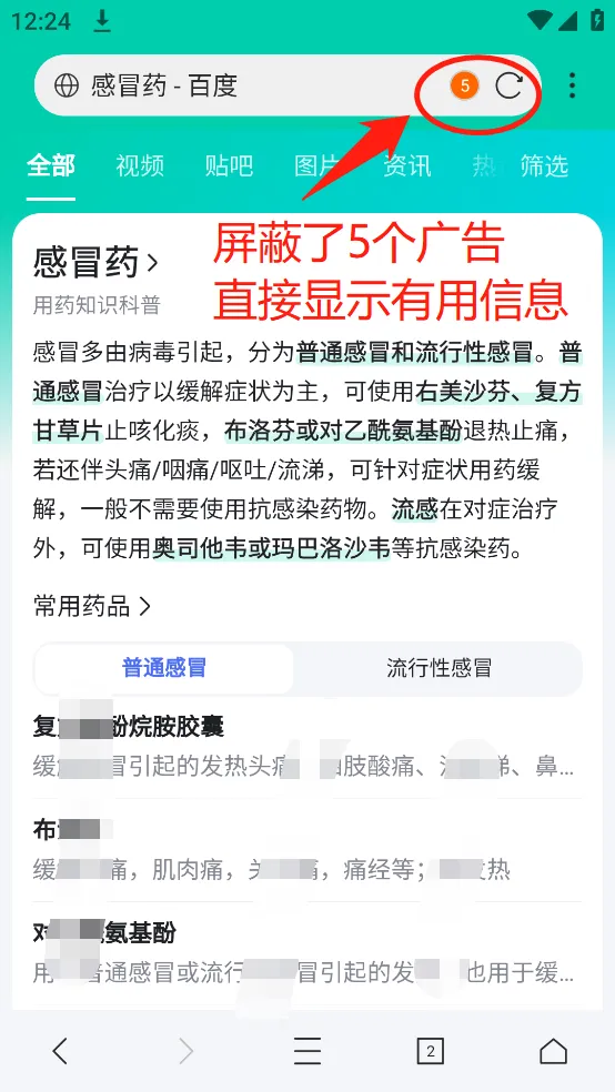 在浏览器下方工具箱中可以开启强力拦截广告,这个功能开启之后搜索网页真的是纵享丝滑,搜啥出啥,基本上百分之90广告都能干掉。
