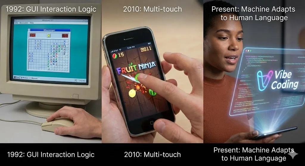 1992 年,当时大家以为微软在 Windows 预装的《扫雷》只是个摸鱼神器,但通过点击一个个方块,人们学会了图形界面交互逻辑。2010 年,大家在 iPhone 上狂刷《水果忍者》切西瓜时,开始适应了多点触控屏幕,慢慢习惯了没有键盘也能操作电脑的交互逻辑。