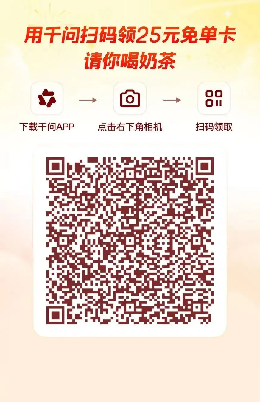 所有用户先更新千问 App 到最新版,打开后都能白拿一张 25 元无门槛免单卡,不仅能免单喝奶茶,也能通过淘宝闪购买年货、点外卖。