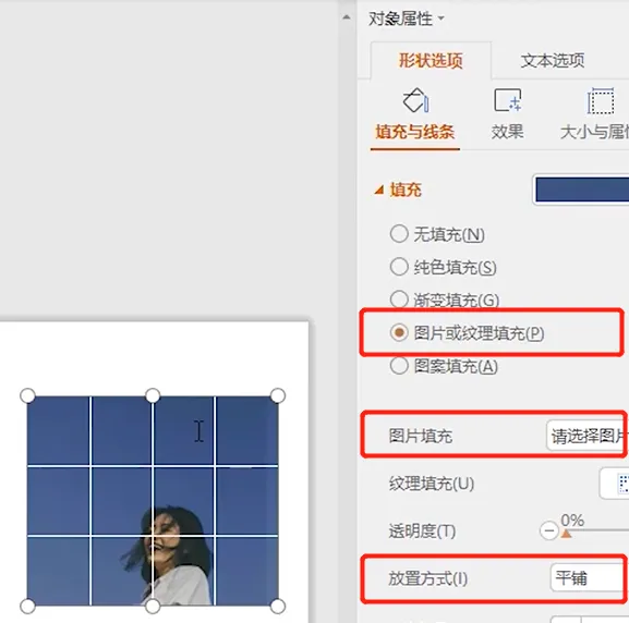 ❸ 在右侧【对象属性】菜单栏中,选择【图片或纹理填充】,在【图片填充】选择一张自己喜欢的图片,将【放置方式】设置为【平铺】。