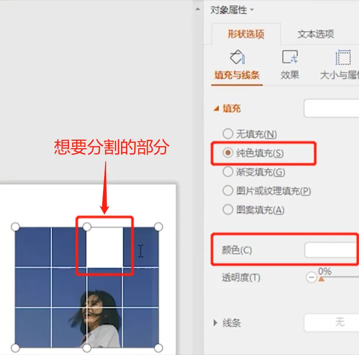 ❹ 鼠标左键选中想要分割的部分,先选择【纯色填充】,再将【颜色】设置为【白色】,