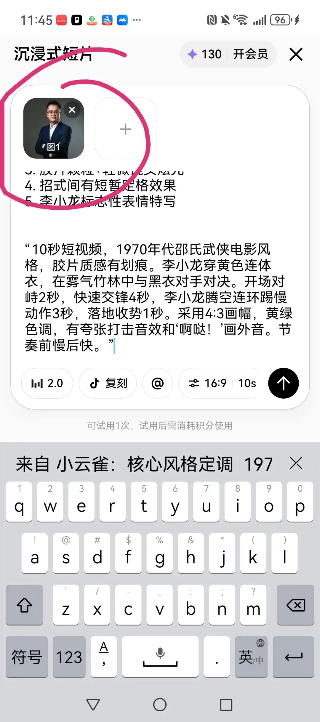 这步是关键。系统弹出提示词后,你就把视频里那个博主的照片换掉,传一张你自己的帅照上去。如果你想让整段视频里你的造型多变一点,可以尝试多传几张不同风格的;如果想求稳,一张清晰的正脸照就足够让AI记住你了。