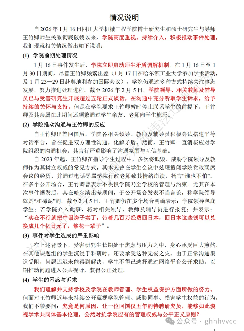 2026 年 2 月 6 日:王竹卿以 “诽谤” 报警;川大成立工作专班,发布首份通报 -