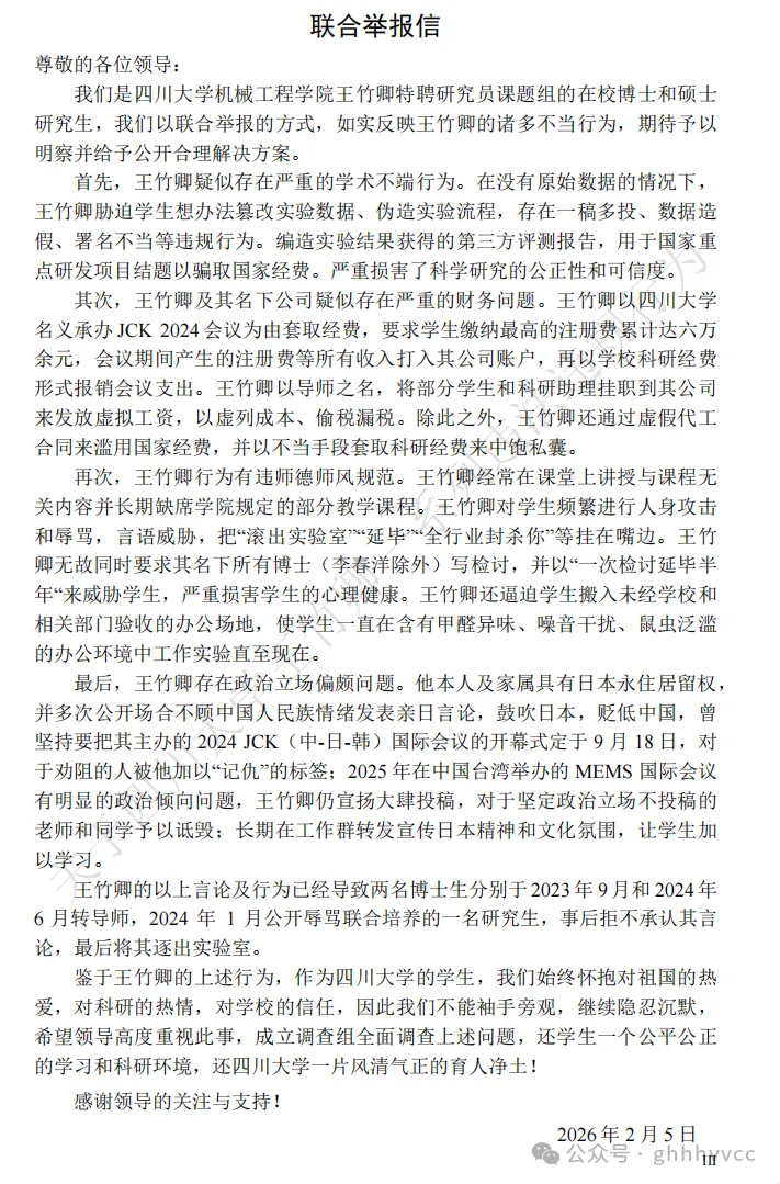 川大王竹卿 83 页 PDF 举报事件,核心是32 名在读硕博生联合实名举报导师学术不端、财务违规、师德失范、政治立场问题,以详实证据引爆舆论;校方已成立专班调查,当事人以 “诽谤” 报案。下面按时间线和关键要素,讲清完整来龙去脉。