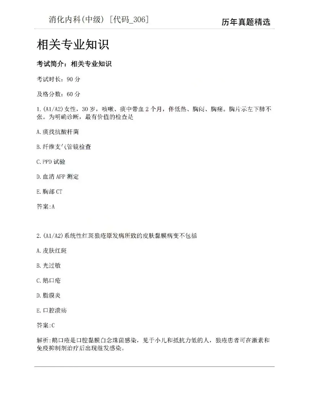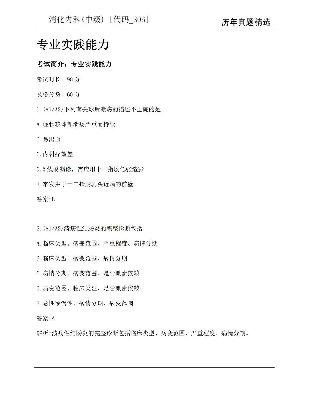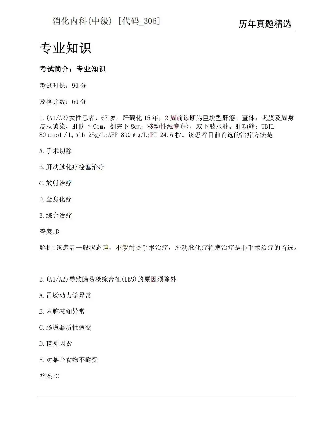 五、消化内科学中级(306)历年真题【历年真题—真题是对考试考点、难度的真实反映,先过一遍历年真题,了解考情和考点,卫生职称往往会存在历年真题重现,考生重点把握】