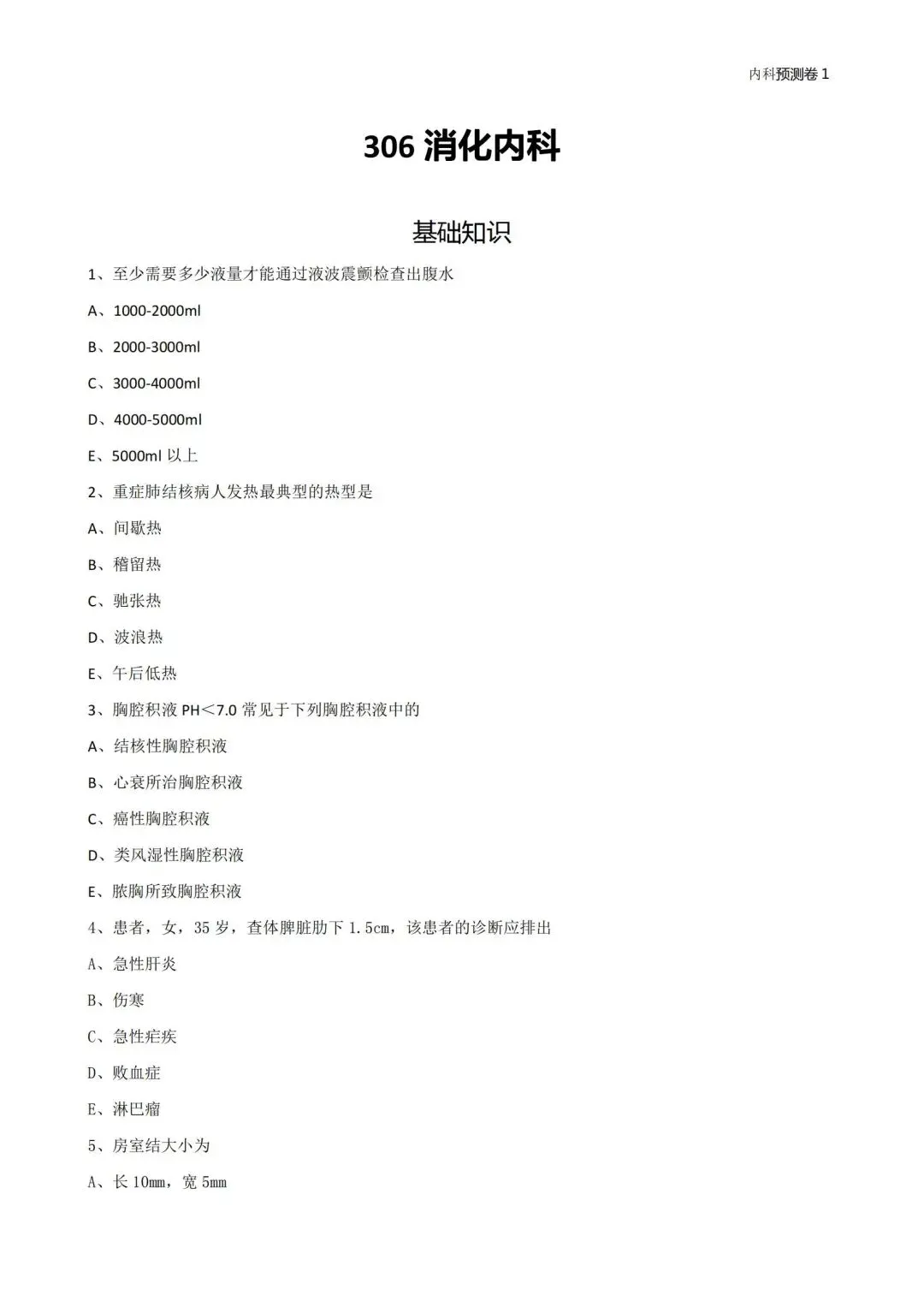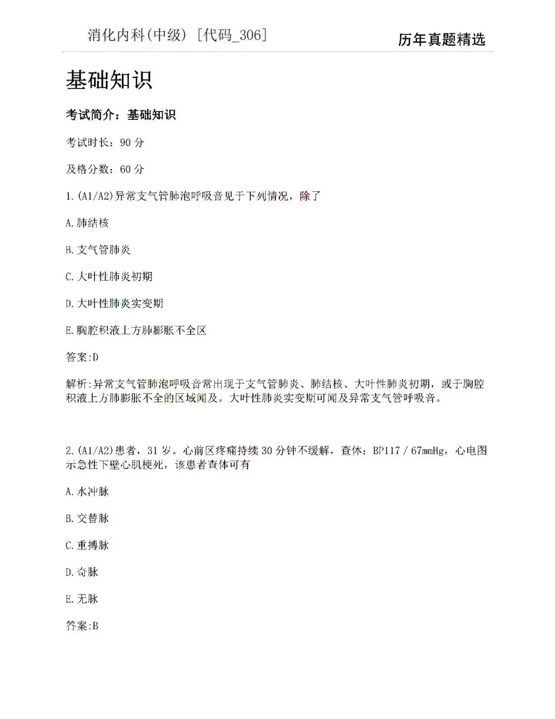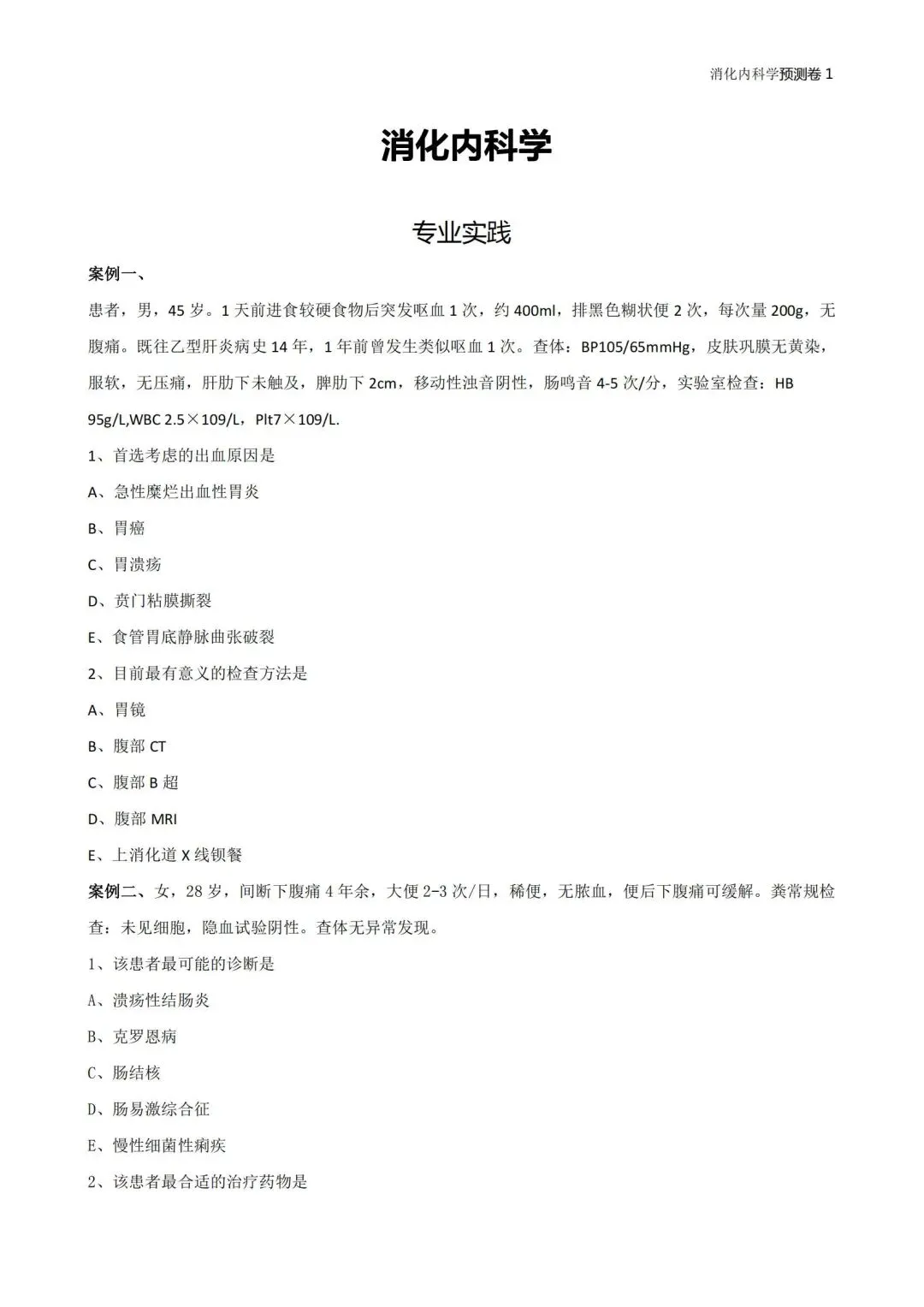 五、消化内科学中级(306)历年真题【历年真题—真题是对考试考点、难度的真实反映,先过一遍历年真题,了解考情和考点,卫生职称往往会存在历年真题重现,考生重点把握】