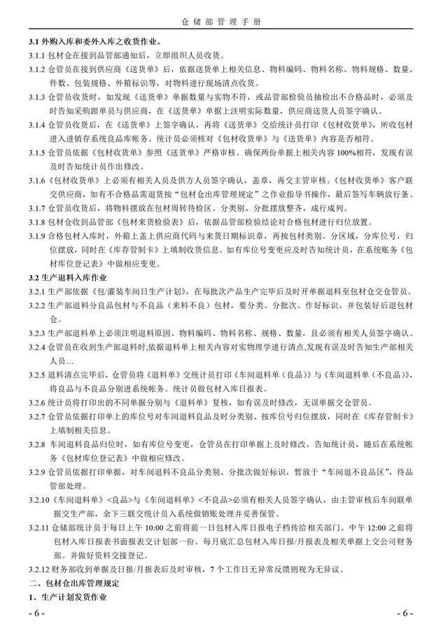 包材仓在接到品管部通知后,立即组织人员收货。仓管员收货时,如发现《送货单》单据数量与实物不符,或品管部检验员抽检出不合格品时,必须及时告知采购跟单员与供应商,在《送货单》单据上注明实际数量,供应商送货人员签字确认。