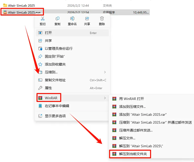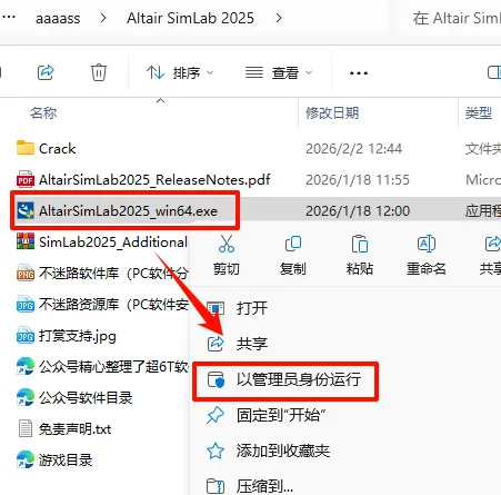 7.返回解压的“Altair SimLab 2025“文件夹,鼠标右键点击“AltairSimLab2025_win64.exe”选择“以管理员身份运行”