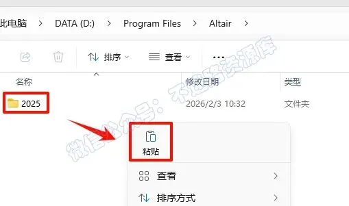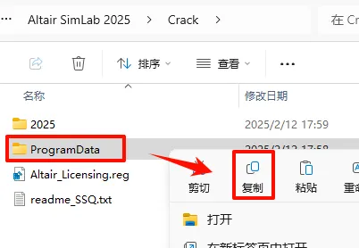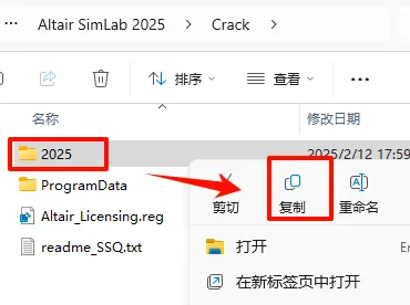 21.返回之前解压的“Altair SimLab 2025“文件夹,打开“Crack”文件夹,选中“2025“文件夹,鼠标右键选择“复制”