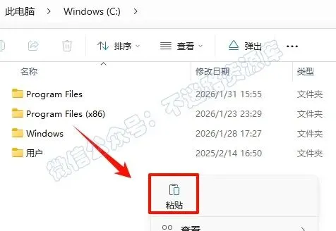 6.打开桌面“此电脑”,打开C盘根目录,粘贴刚刚复制的文件