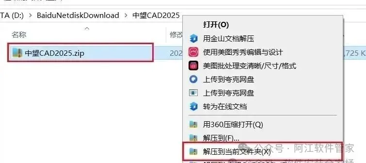 1.打开下载的中望CAD软件安装包,鼠标右击压缩包选择【解压到当前文件夹】。