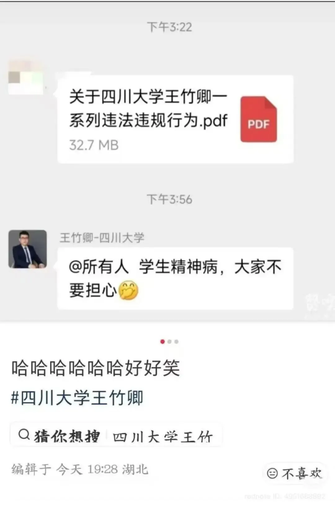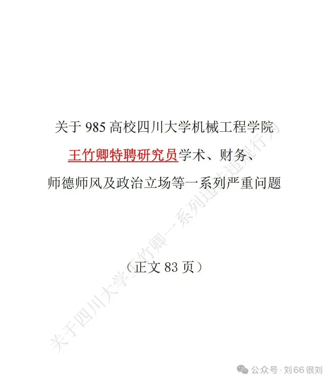 近日,四川大学某课题组多名在读硕士、博士研究生联名举报王竹卿,并提交了一份长达83页的PDF材料作为佐证,指控其存在学术不端、侵占科研经费、师德失范等问题。