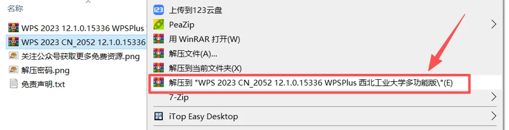 1.将提供资源下载好后,随机找到一个压缩包,鼠标右键【解压到 W-P–S 2023 CN_2052 12.1.0.15336 W-P–SPlus 西北工业大学多功能版\】。