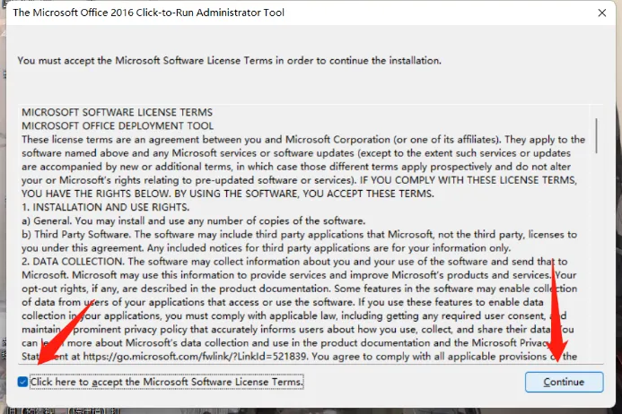2️⃣下载后,为方便寻找,可以先在桌面新建一个名为office的文件夹,再打开部署工具,先勾选同意协议并点击Continue;