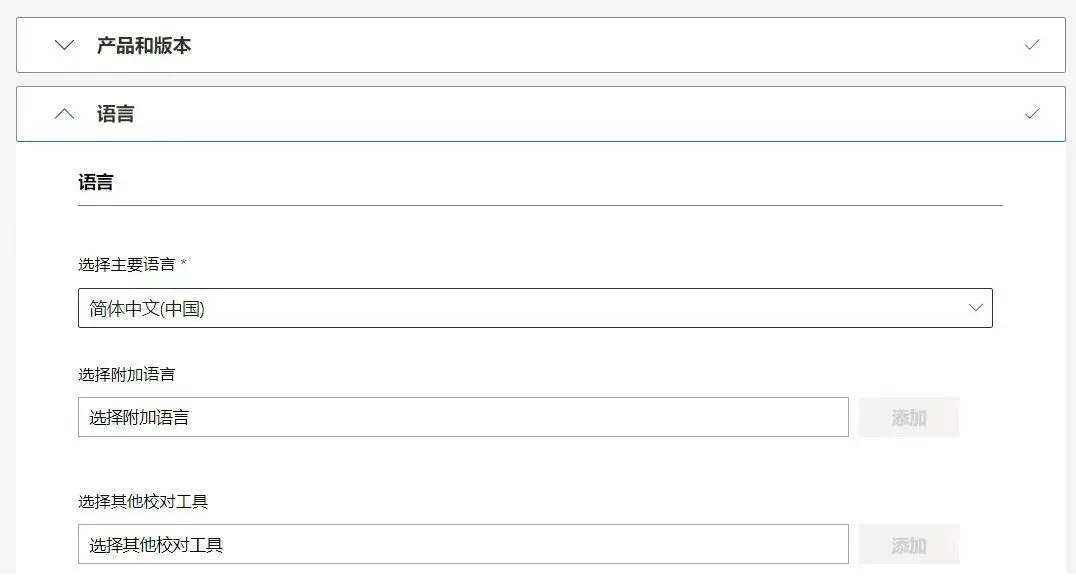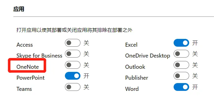 3️⃣对“应用”进行选择。常用的有Word、PowerPoint、Excel以及Office的笔记软件OneNote。然后是对“语言”进行选择,选择主语言为简体中文。