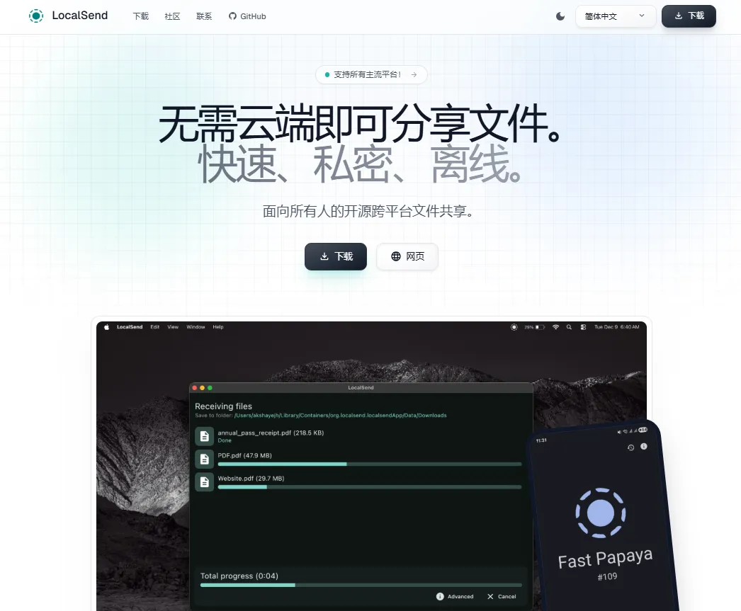 这里介绍一款名为“LocalSend”,免费开源的跨平台局域网文件传输工具,允许安全地在不同设备间快速、私密、离线共享文件和消息。