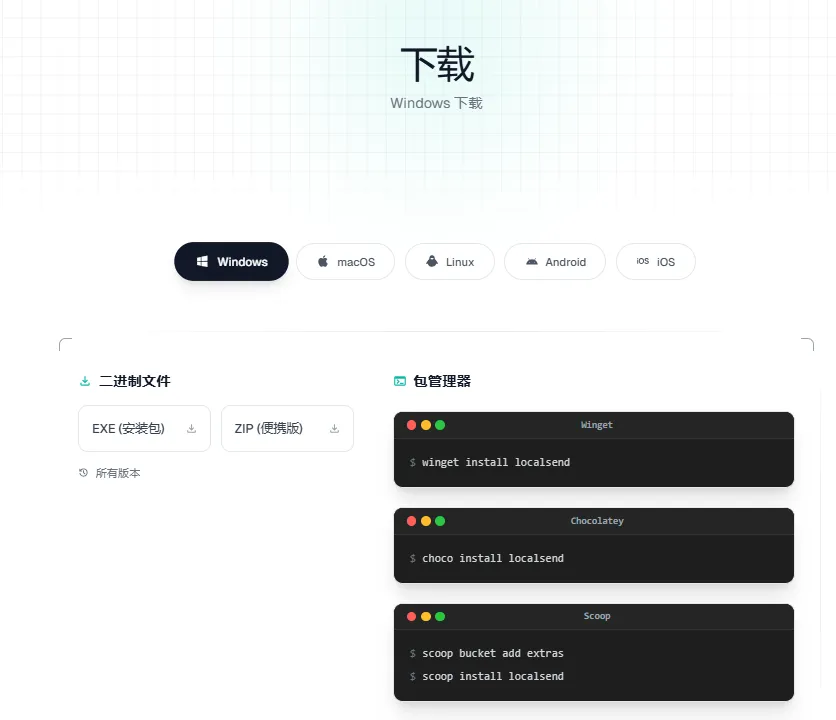 官网主页可点击原文链接,因为之前直接贴网址,被判定有诱导嫌疑,如果是Windows或者安卓下载,可以直接公众号回复:localsend,会自动回复网盘下载的链接。