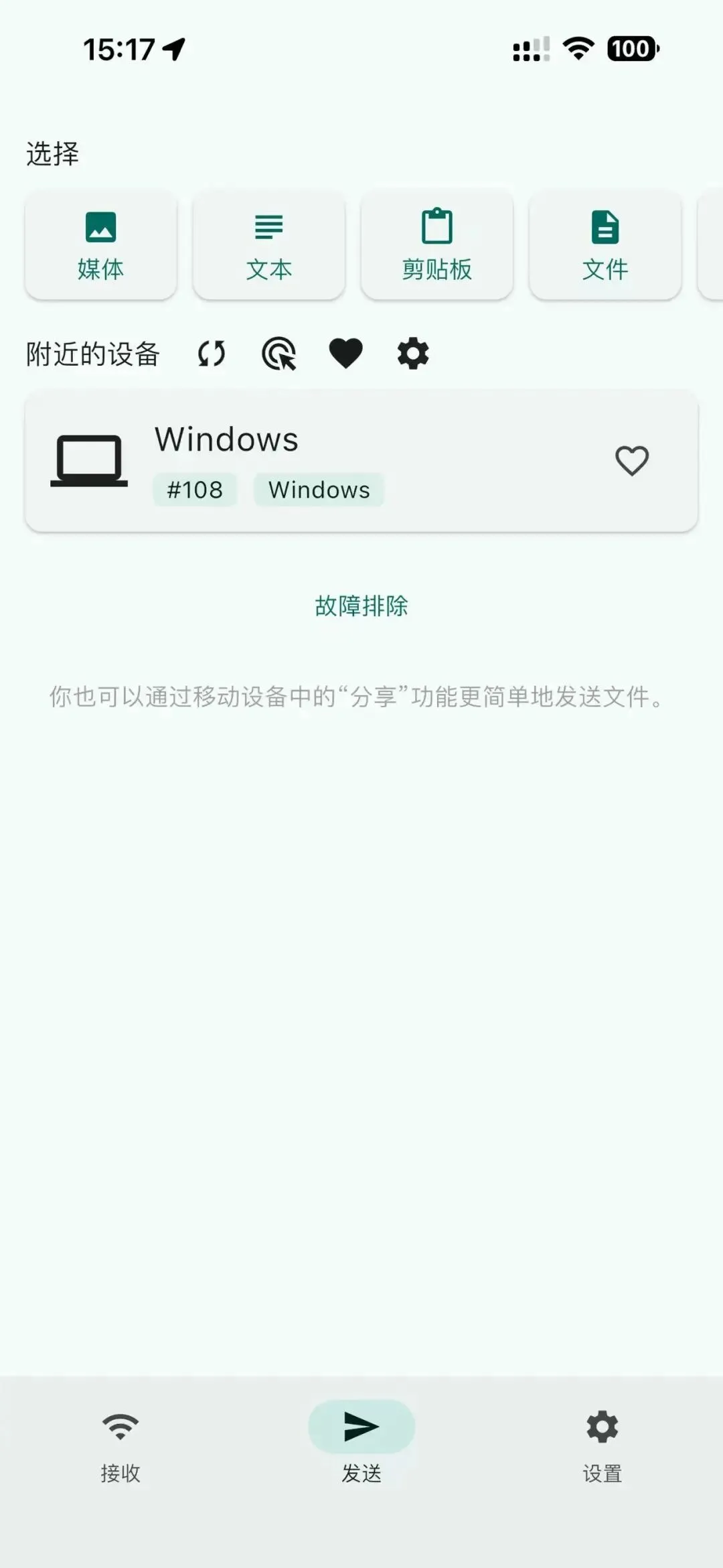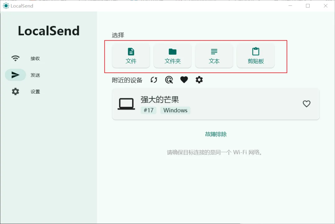 默认界面是接收,打开发送,刷新,可以找到网络里的其他安装localsend的设备,可以选择文件、文件夹、文本消息或者是直接复制粘贴板的内容,然后选择需要发送到的设备就可以了。